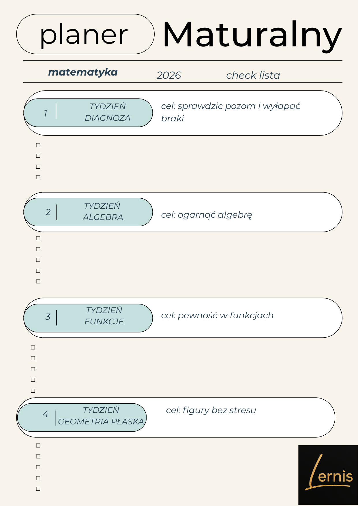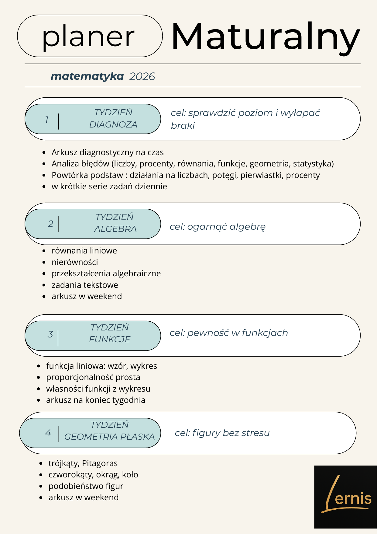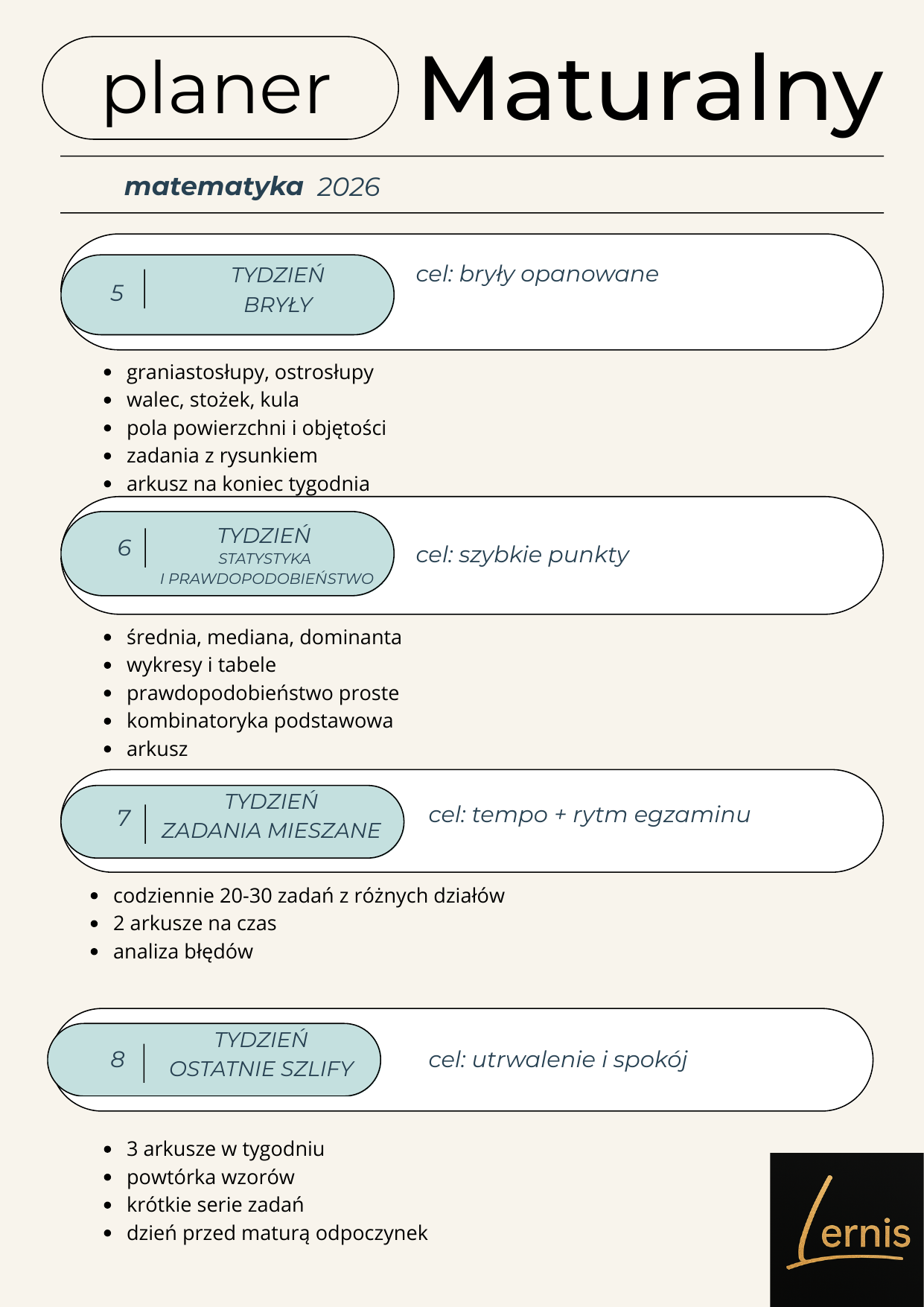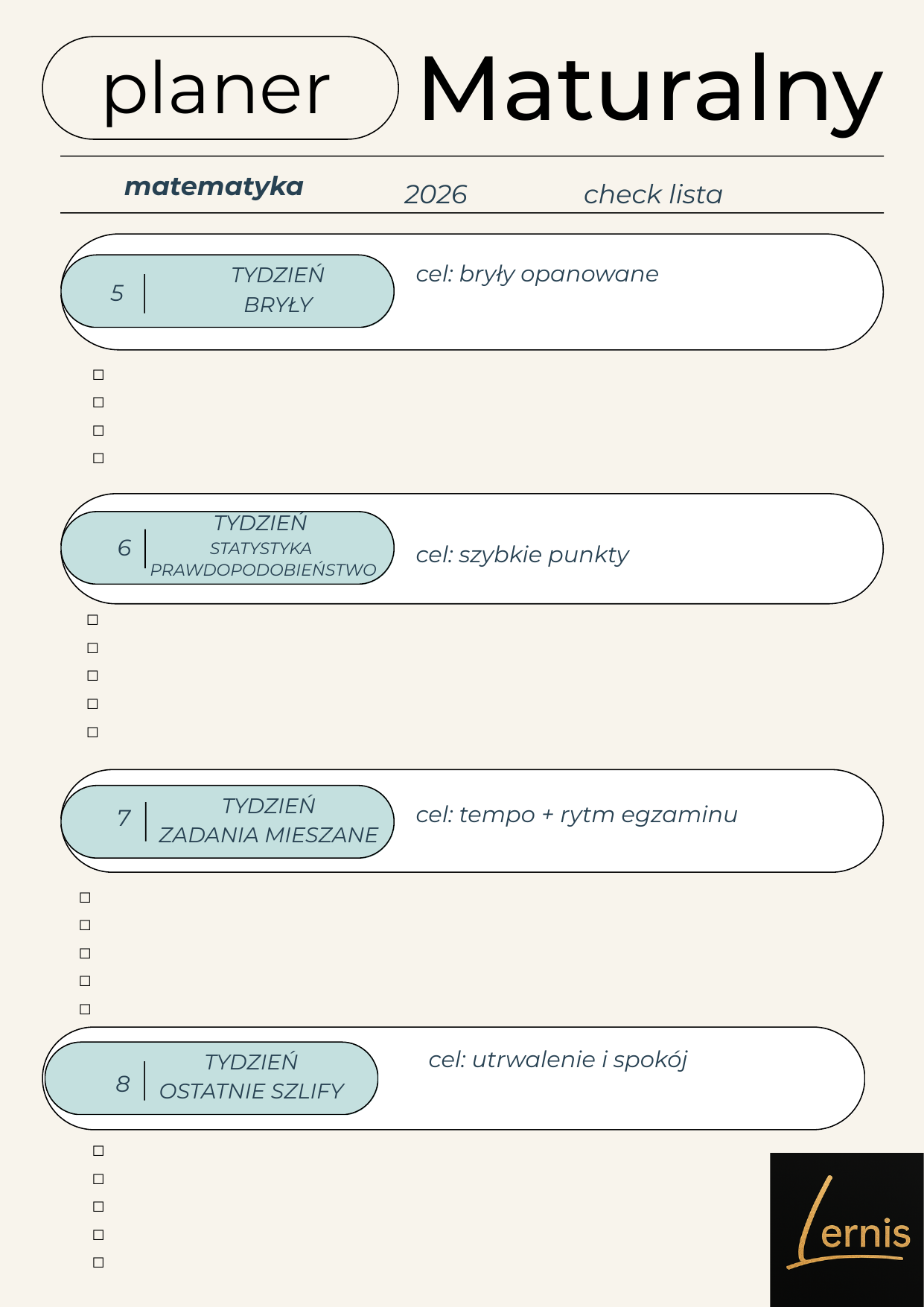 Darmowy planer maturalny z matematyki pomoże Ci rozłożyć powtórki na 8 tygodni, uporządkować najważniejsze działy i lepiej zaplanować naukę do egzaminu. W środku znajdziesz plan pracy, checklistę postępów oraz miejsce na własne notatki.